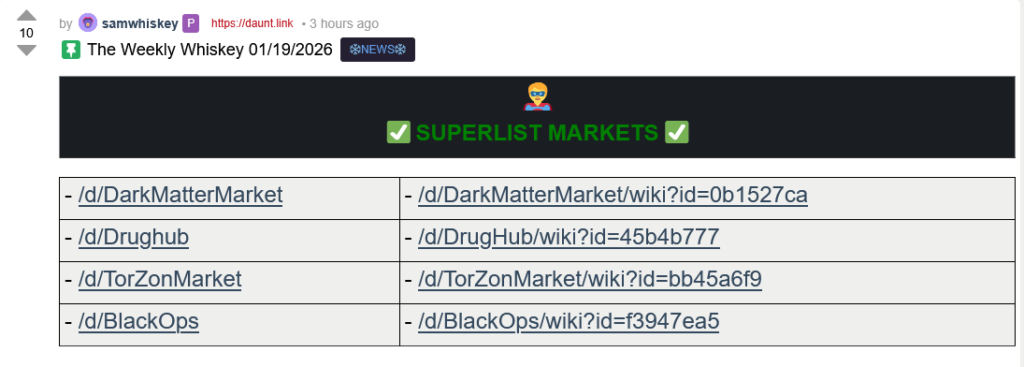 Full version can be found on Dread: https://dreadytofatroptsdj6io7l3xptbet6onoyno2yv7jicoxknyazubrad.onion/post/a9fa8a5deb3a54b33fb7 Tor browser is required to access any .onion links. 🦸 ✅ SUPERLIST MARKETS ✅ – /d/DarkMatterMarket – /d/DarkMatterMarket/wiki?id=0b1527ca – /d/Drughub – /d/DrugHub/wiki?id=45b4b777 – /d/TorZonMarket – /d/TorZonMarket/wiki?id=bb45a6f9 – /d/BlackOps – /d/BlackOps/wiki?id=f3947ea5 ❤️ WHAT’S HAPPENING ON DREAD? ❤️ Bug fix update now live /post/db1372f14a005e67bc16 New Release: Tor Browser 15.0.4 […]