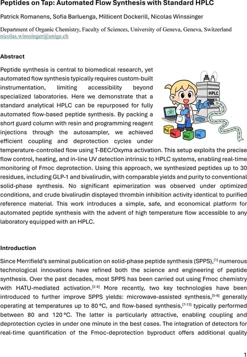 Peptide synthesis is central to biomedical research, yet automated flow synthesis typically requires custom-built instrumentation, limiting accessibility beyond specialized laboratories. Here we demonstrate that a standard analytical HPLC can be repurposed for fully automated flow-based peptide synthesis. By packing a short guard column with resin and programming reagent injections through the autosampler, we achieved efficient […]