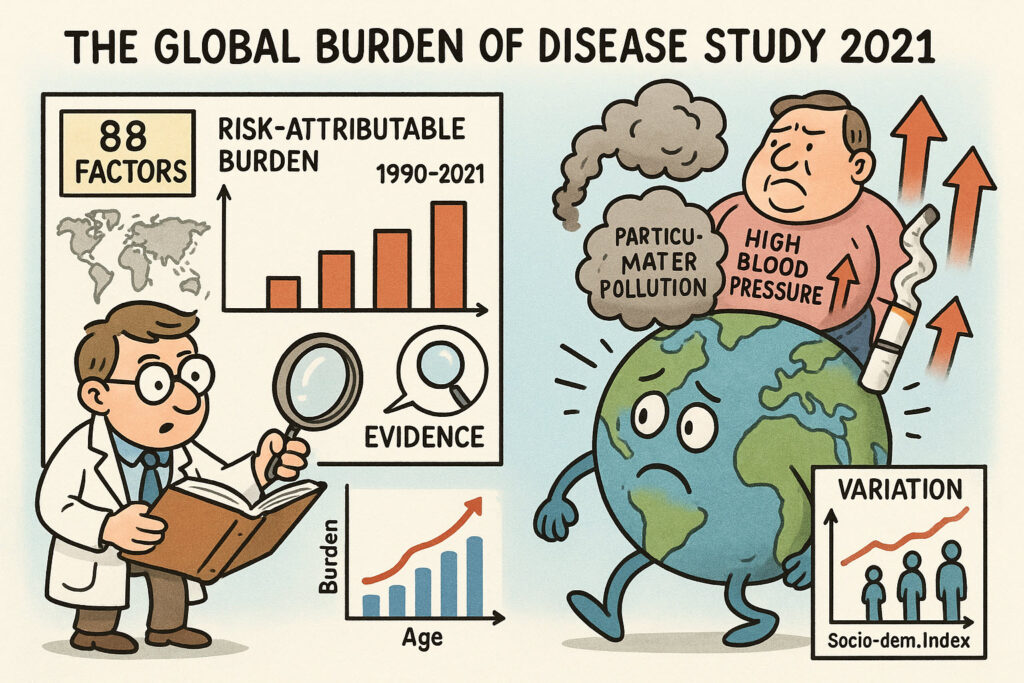 This extensive report from the Global Burden of Disease Study 2021 presents a comprehensive analysis of 88 risk factors and their impact on global health outcomes across 204 countries and territories from 1990 to 2021. The study employed a detailed methodology using a vast array of data to estimate the exposure levels and relative health risks associated with these factors. Findings highlight particulate matter pollution, high blood pressure, and smoking as leading contributors to global disease burden in 2021, with metabolic risks increasing significantly over the study period. The research also examines trends over time and variations in risk-attributable burden by age, sex, location, and socio-demographic index, offering valuable insights for public health policy and intervention prioritization, including a new method to assess the strength of evidence for risk-outcome relationships.