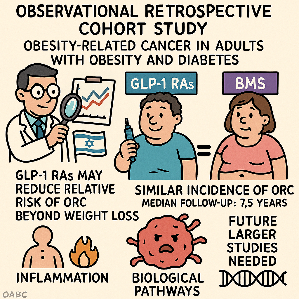 This paper presents an observational, retrospective cohort study comparing the incidence of obesity-related cancer (ORC) in adults with obesity and diabetes treated with first-generation GLP-1 receptor agonists (GLP-1 RAs) versus bariatric metabolic surgery (BMS). The research, based on Israeli health service data, found a similar incidence of ORC between the two treatment groups over a median follow-up of 7.5 years. Notably, the study suggests that GLP-1 RAs may offer a relative risk reduction for ORC compared to BMS that goes beyond the effects of weight loss, potentially due to other mechanisms like reducing inflammation. The authors acknowledge the need for future, larger studies to confirm these findings and investigate the underlying biological pathways.