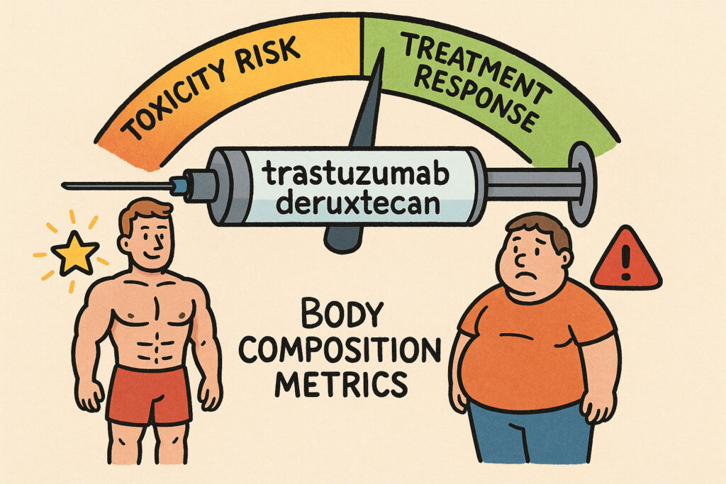 This scientific article explores the connection between a patient’s body composition and their experience with the drug trastuzumab deruxtecan (T-DXd) for metastatic breast cancer. Using computed tomography scans to measure muscle and fat tissue, the study found that higher amounts of both subcutaneous and visceral fat, as well as lower fat density and a higher body mass index (BMI), were linked to a greater need for T-DXd dose reductions due to toxicity. Specifically, high subcutaneous fat was also associated with a lower chance of a positive treatment response. These findings suggest that considering body composition metrics could lead to more individualized and potentially safer treatment plans for patients receiving this therapy.