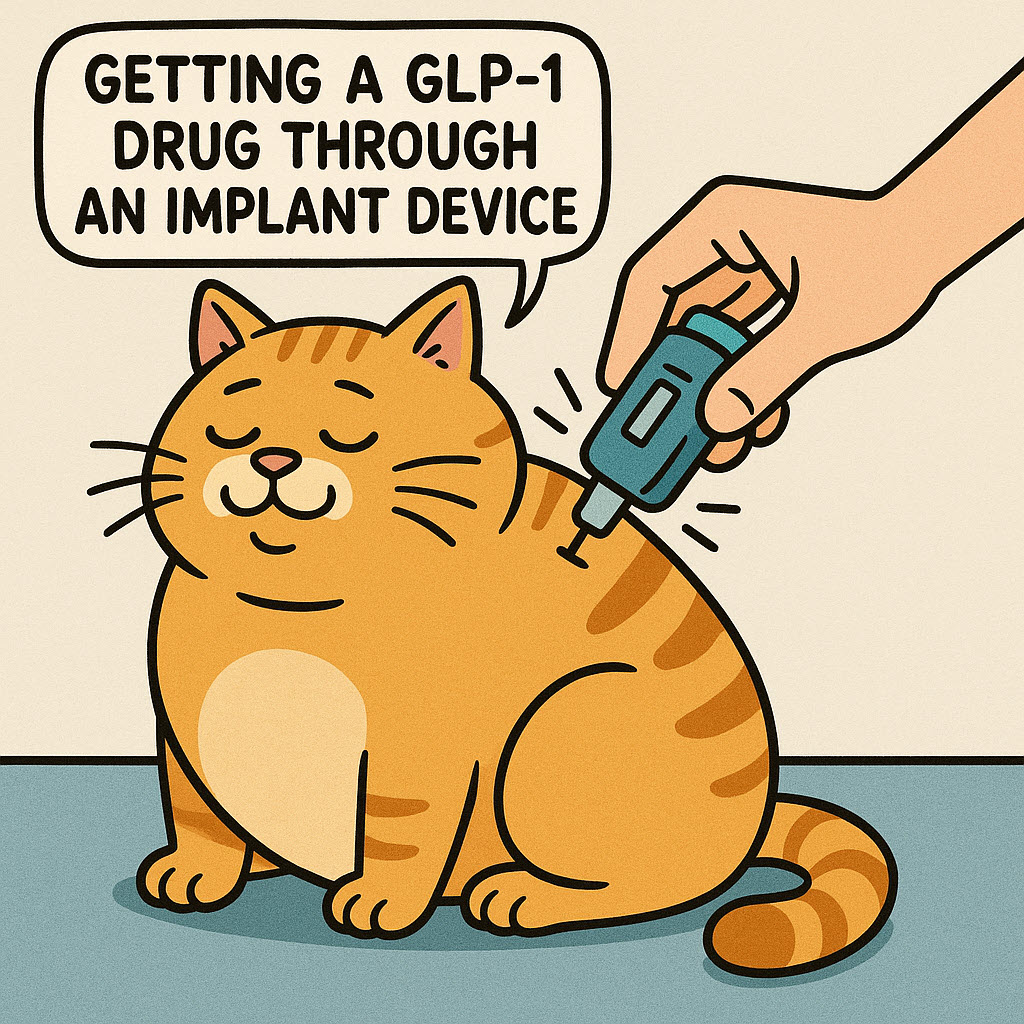 One such company is called Vivani Medical (formerly Nano Precision Medical) Emeryville, CA. They have a product called OKV-119, a subdermal implant delivering exenatide (a GLP-1 RA) to their target species, cats. In a study involving five cats, the implant maintained therapeutic drug levels for over 84 days, leading to a sustained weight loss of at least 5% in four cats over a 112-day period. (BMC Veterinary Research, May 18, 2024)
