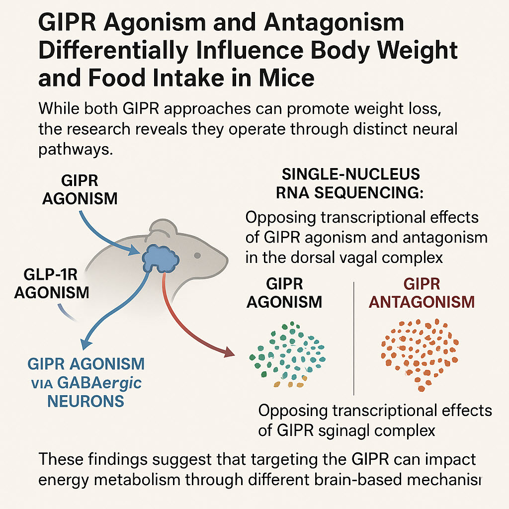 This scientific paper explores the mechanisms by which GIPR agonism and antagonism influence body weight and food intake in mice, particularly in combination with GLP-1R agonism. While both GIPR approaches can promote weight loss, the research reveals they operate through distinct neural pathways. The study demonstrates that GIPR agonism acts via GABAergic neurons in a GLP-1R-independent manner, whereas GIPR antagonism requires functional GLP-1R signaling and does not depend on GIPR signaling in GABAergic or peripheral neurons. Single-nucleus RNA sequencing further supports this by showing opposing transcriptional effects of GIPR agonism and antagonism in the dorsal vagal complex, with GIPR antagonism closely resembling GLP-1R signaling. These findings suggest that targeting the GIPR can impact energy metabolism through different brain-based mechanisms.