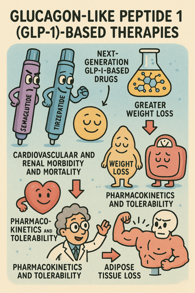 This review article discusses GLP-1-based therapies, highlighting their effectiveness for managing type 2 diabetes and obesity, including well-known drugs like semaglutide and tirzepatide. The text details the evolution of these medicines, from early shorter-acting versions to current long-acting injectables and promising oral formulations and multi-agonists. The review also covers the pharmacokinetics, efficacy, and safety profiles of approved and emerging therapies, emphasizing their benefits in reducing cardiovascular and renal complications. Furthermore, it explores the potential expansion of GLP-1-based drugs to treat a wide range of conditions, including sleep apnea, metabolic liver disease, and various neuropsychiatric disorders, underscoring the ongoing research and development in this field.