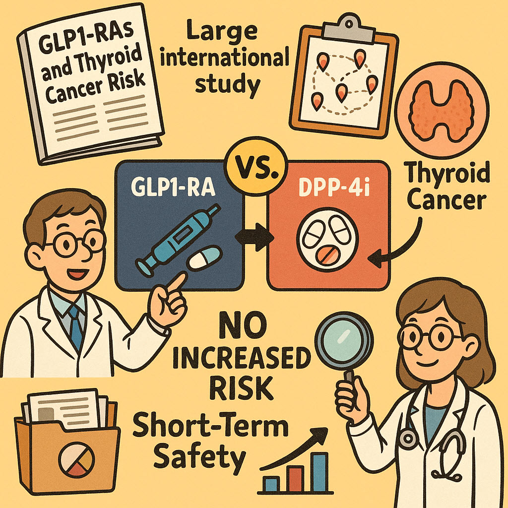 This research article investigates the potential link between glucagon-like peptide 1 receptor agonists (GLP1-RAs), medications used for type 2 diabetes, and the risk of developing thyroid cancer. Conducted as a large, international study across multiple sites in six countries, it compared GLP1-RA users with those using dipeptidyl peptidase-4 inhibitors (DPP-4is), another class of diabetes drugs. Analyzing a substantial number of patients, the study found no increased risk of thyroid cancer associated with GLP1-RA use during the observed follow-up period. Furthermore, increasing cumulative doses of GLP1-RAs did not show an increased risk, although the authors acknowledge that the relatively short follow-up duration limits conclusions about long-term effects. Supplementary analyses generally supported these findings, providing reassurance regarding the short-term safety of these medications concerning thyroid cancer.
