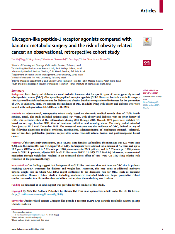 Glucagon-like peptide-1 receptor agonists compared with bariatric metabolic surgery and the risk of obesity-related cancer: an observational, retrospective cohort studyWolff Sagy, Yael et al. eClinicalMedicine, Volume 83, 103213 This paper presents an observational, retrospective cohort study comparing the incidence of obesity-related cancer (ORC) in adults with obesity and diabetes treated with first-generation GLP-1 receptor agonists (GLP-1 RAs) versus bariatric metabolic surgery (BMS). […]