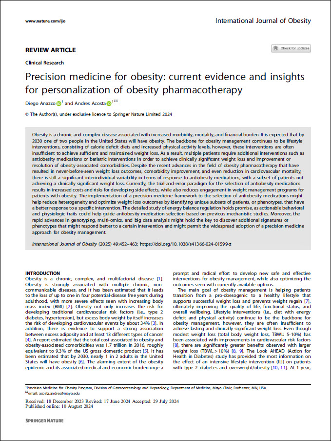 Anazco D, Acosta A. Precision medicine for obesity: current evidence and insights for personalization of obesity pharmacotherapy. Int J Obes (Lond). 2025 Mar;49(3):452-463. doi: 10.1038/s41366-024-01599-z. Epub 2024 Aug 10. PMID: 39127792; PMCID: PMC11931505. Published 10 August 2024 This review article explores the potential of precision medicine to improve obesity management, moving away from the current trial-and-error approach for selecting medications. […]