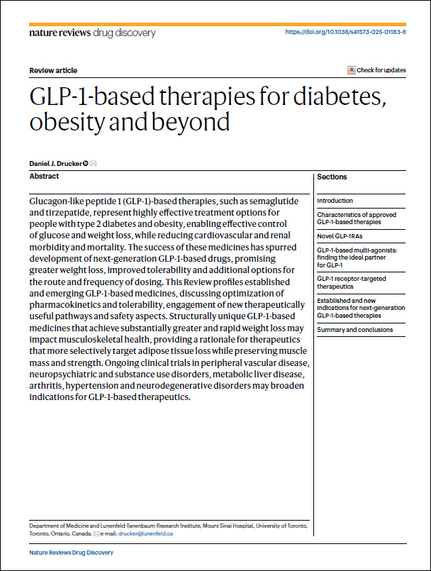 by Daniel J Drucker Nature Reviews Drug Discovery Drucker DJ. GLP-1-based therapies for diabetes, obesity and beyond. Nat Rev Drug Discov. 2025 Apr 25. doi: 10.1038/s41573-025-01183-8. Epub ahead of print. PMID: 40281304. This review article discusses GLP-1-based therapies, highlighting their effectiveness for managing type 2 diabetes and obesity, including well-known drugs like semaglutide and tirzepatide. The text details the evolution […]
