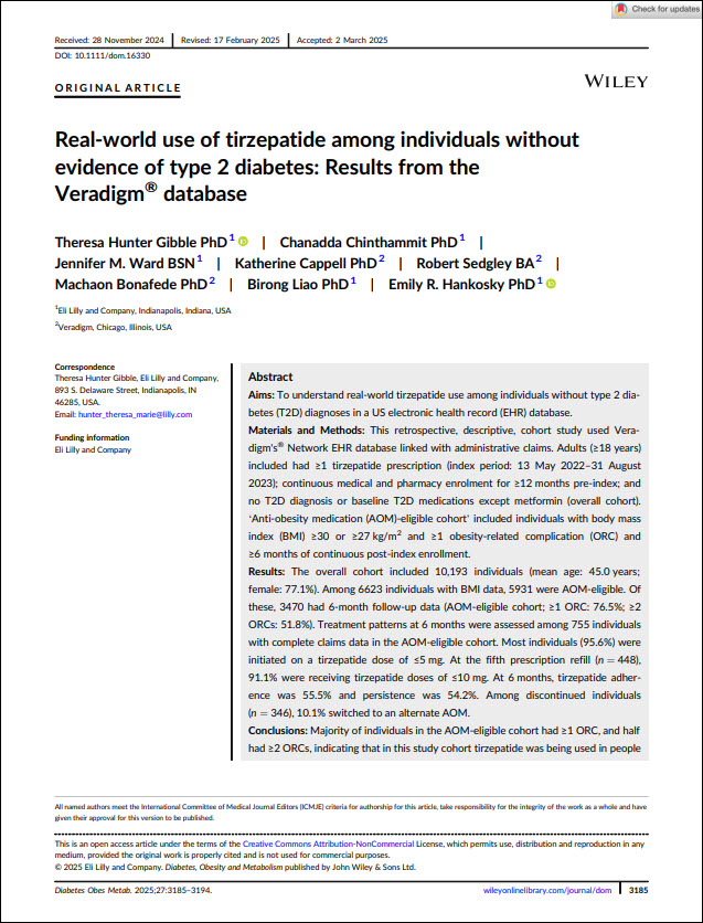 March 14, 2025 Hunter Gibble T, Chinthammit C, Ward JM, Cappell K, Sedgley R, Bonafede M, Liao B, Hankosky ER. Real-world use of tirzepatide among individuals without evidence of type 2 diabetes: Results from the Veradigm® database. Diabetes Obes Metab. 2025 Jun;27(6):3185-3194. doi: 10.1111/dom.16330. Epub 2025 Mar 14. PMID: 40084533; PMCID: PMC12046461. This source describes […]