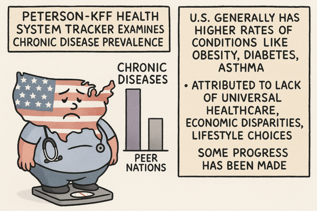 There is a significant burden of chronic diseases in the United States, comparing its rates to other developed nations. One source from the Peterson-KFF Health System Tracker points out that the U.S. has higher rates of many chronic illnesses, including obesity, diabetes, and asthma, compared to its peers, contributing to higher death rates and shorter life expectancy. The other source, a publication from the CDC, focuses on trends in chronic conditions among U.S. adults by age group, showing a concerning increase in prevalence, particularly among younger adults, with obesity and depression being key contributors to this trend. Both sources emphasize the complexity of the issue, citing factors like healthcare access, socioeconomic conditions, and lifestyle, and underscore the importance of prevention and management strategies tailored to different life stages to improve public health.
