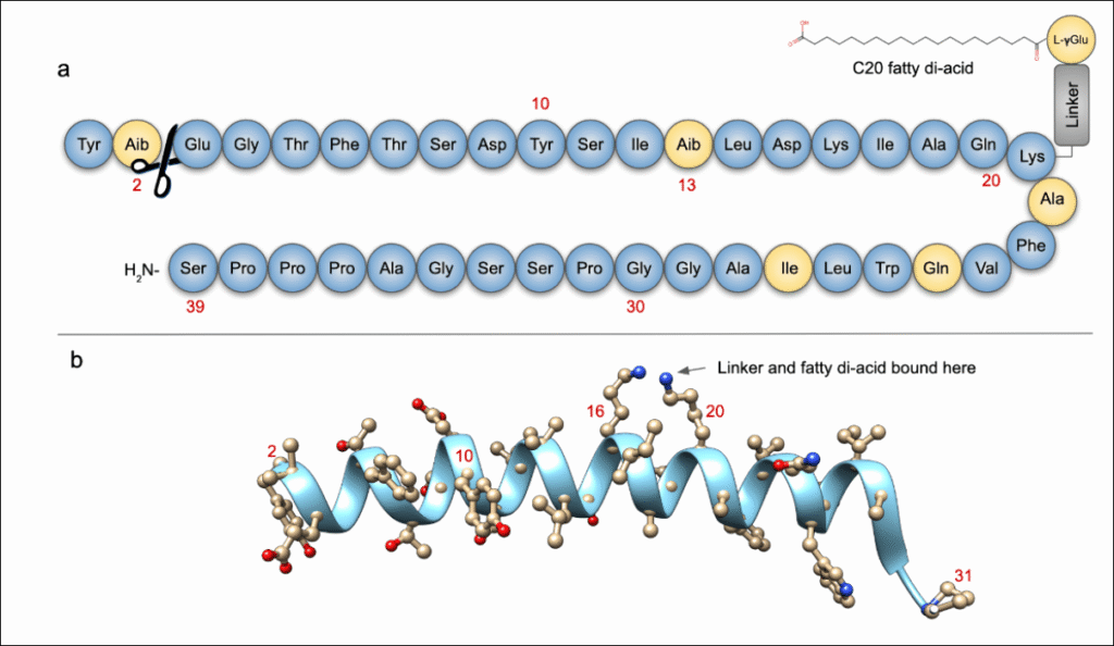 - Tirzepatide contains a C20 fatty diacid moiety (similar to semaglutide) to prolong half-life by albumin binding.